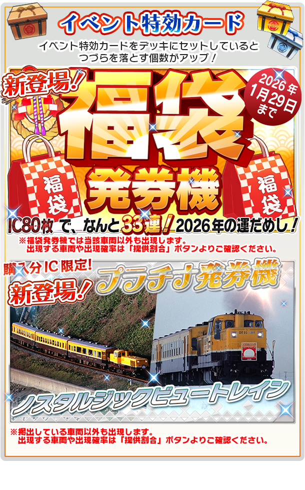 記念発券機の特効カード出現確率は予告なく変更することがあります。変更前に使用したICは払い戻しできません。あらかじめご了承ください。